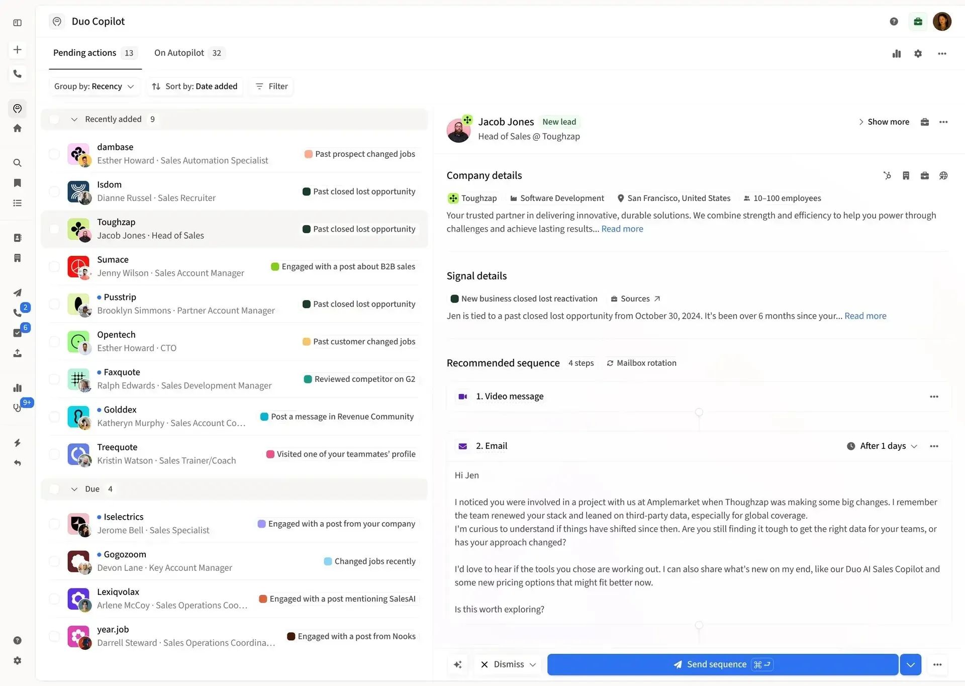 Use Duo AI Copilot: Get daily suggestions for prospects, personalized messaging, and follow-up reminders to save time.